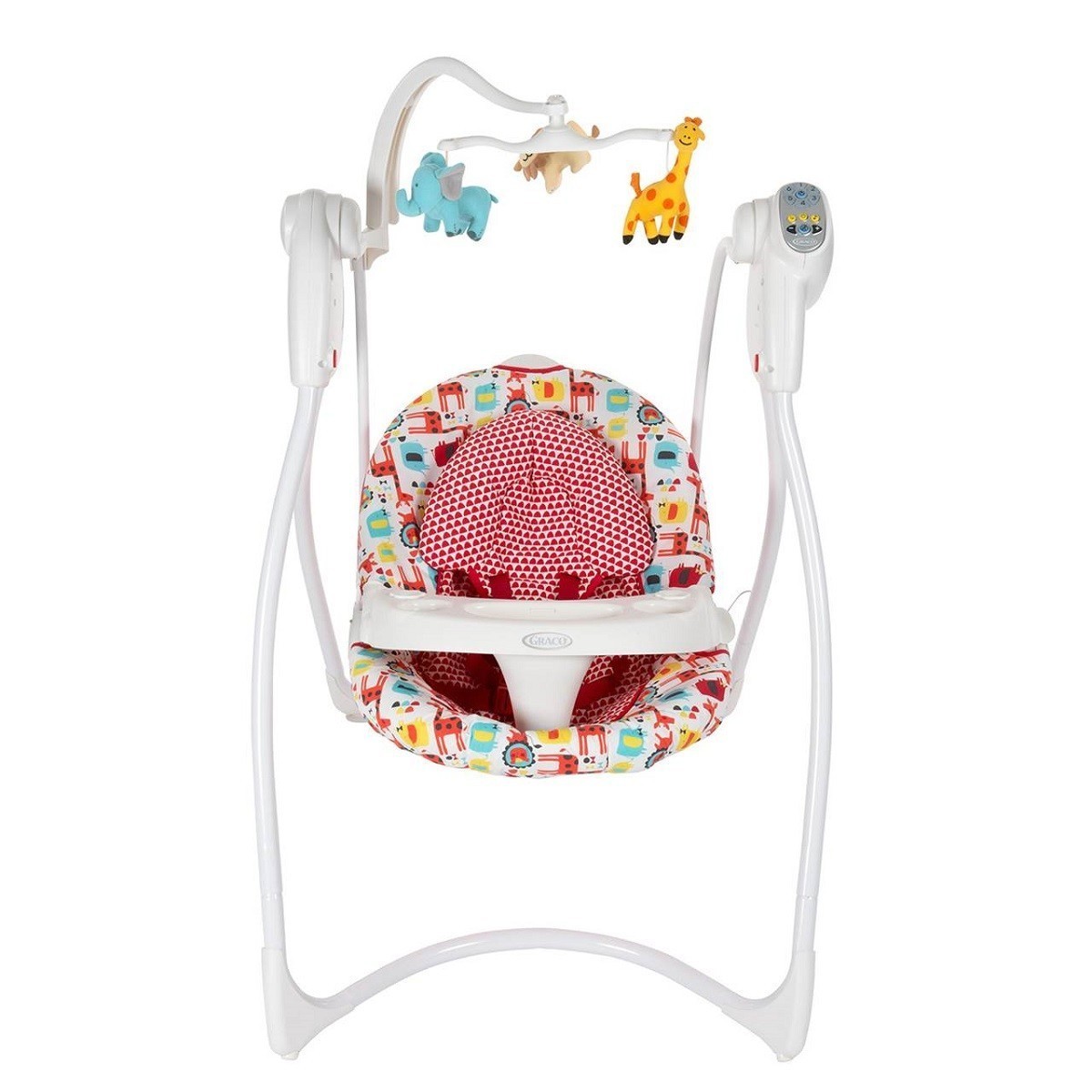 Poate fi folosit ca scaun de masa atunci cand nu e activata functia de leganare: prevazut cu tavita speciala pentru masa;