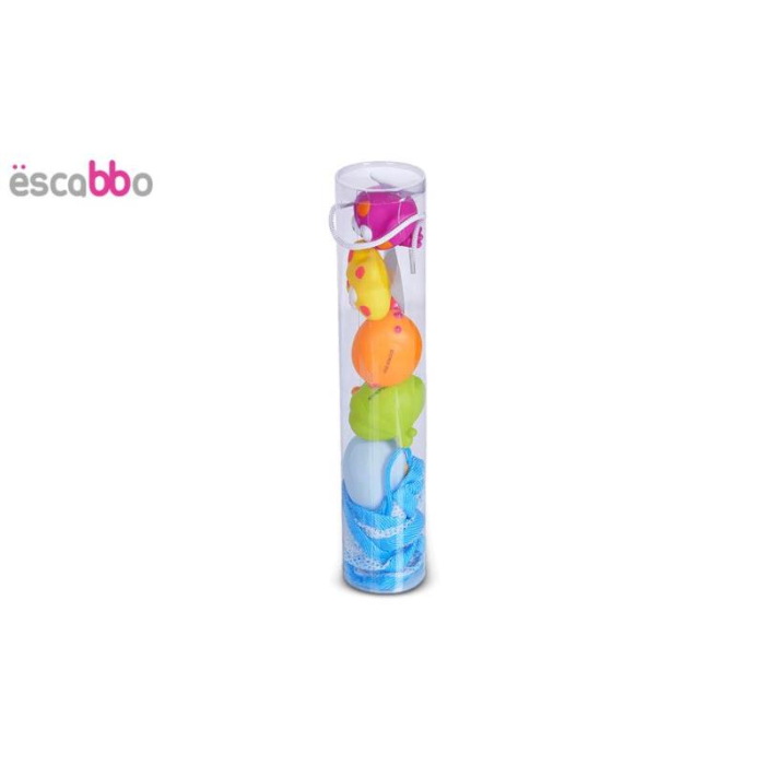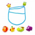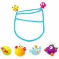Setul contine un saculet de depozitare impreuna cu 2 ventuze cu figurine haioase si 4 jucarii de baie moi, cu marginile rotunjite pentru siguranta copilului.